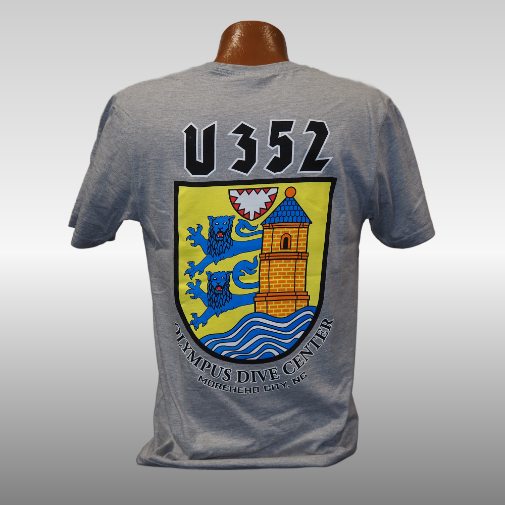The Crest of the U352 Submarine on a T-shirt is the epitome of dive shirts. It features the U352 Crest on the back and the Olympus logo on the front. This T-shirt is made from Cotton/Poly Blend and is oh so soft! It will become your new favorite dive shirt!