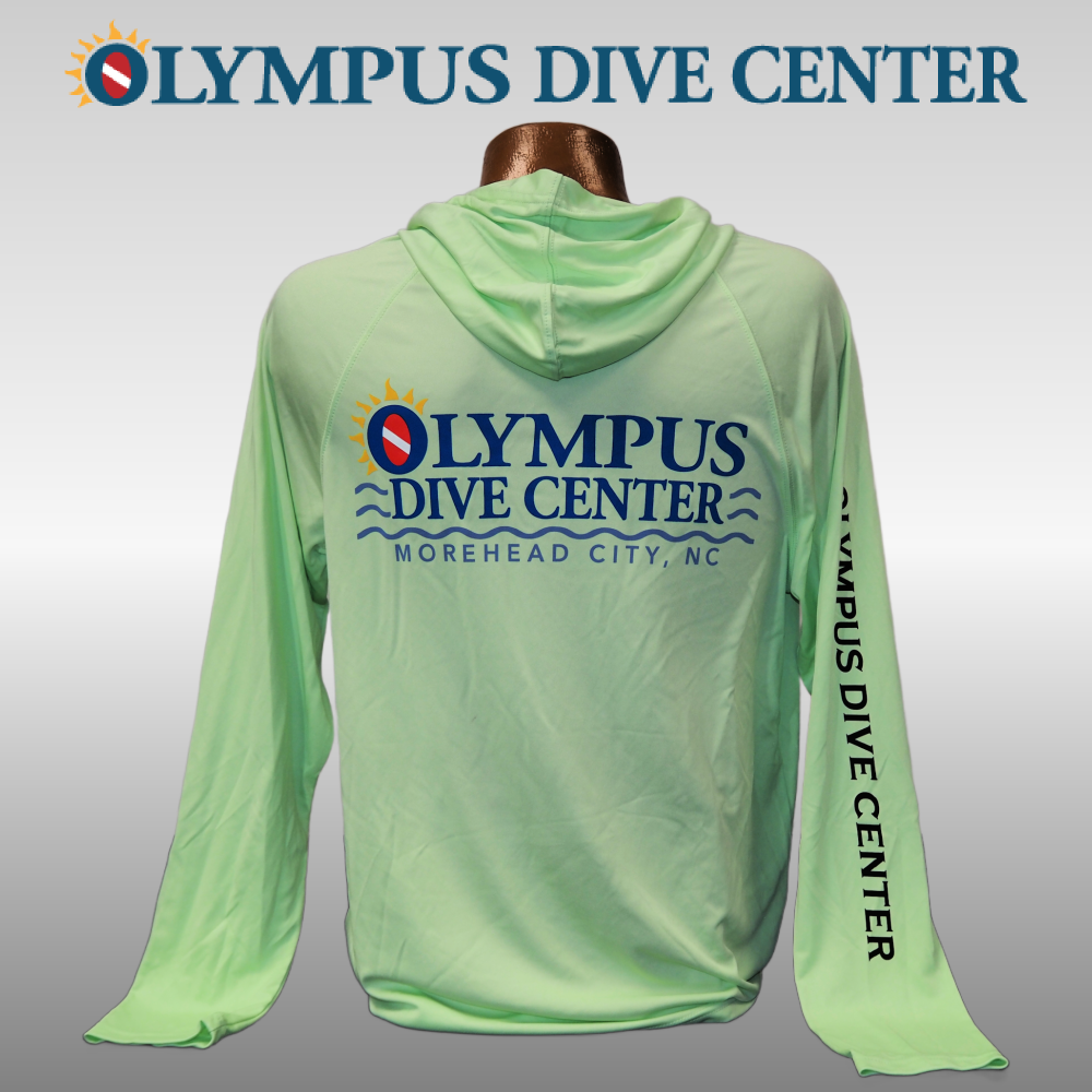Our full color Olympus Dive Center Logo on the back of this comfortable, lightweight, cooling performance long sleeve hoodie.